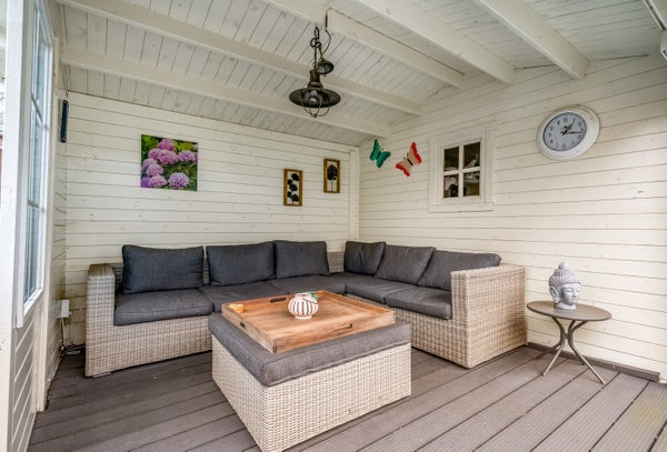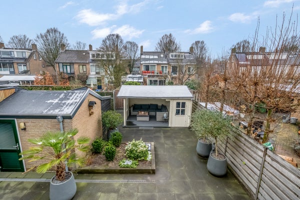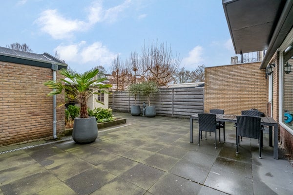De royale achtertuin op het westen is voor een groot deel betegeld, waardoor er genoeg plek is om in de zon te zitten. In de stenen berging kunnen de fietsen staan en het overdekte terras met berging is een echte blikvanger in de tuin.