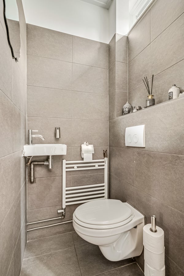 De badkamer vernieuwd, met gebruik van mooie materialen in stijlvolle kleuren. Grote antracietkleurige wandtegels maken de badkamer optisch groter en de ruimte is ingedeeld met een douche, een hangend toilet en een badmeubel met wastafel.