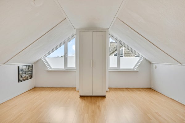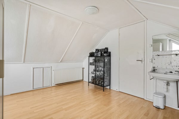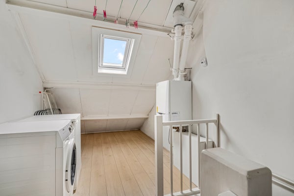 Een vaste trap geeft toegang tot de tweede verdieping, met laminaat op de vloer en een hoge nok. Op de overloop is plek voor de wasapparatuur, de wasmand, een wasrek en de HR-ketel. De aansluitende slaapkamer met wastafel is een superleuke kinderkamer, werkkamer, hobbyruimte of master bedroom.