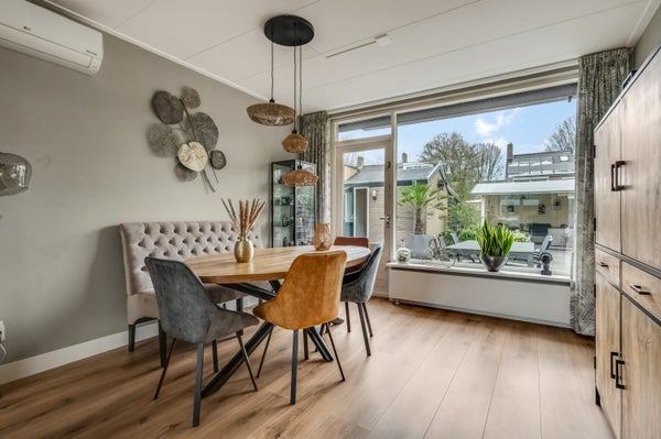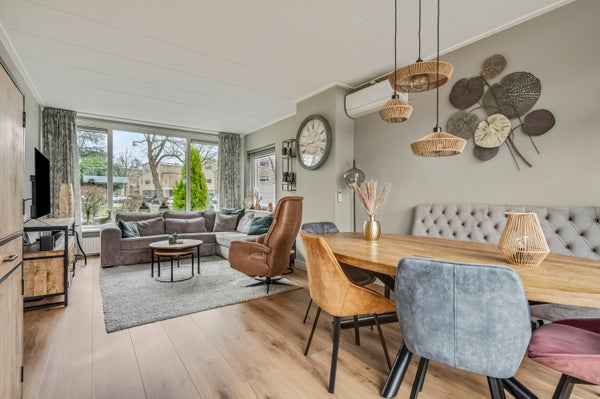 De woon-/eetkamer heeft een oppervlakte van circa 28 m2, met het zitgedeelte aan de voorzijde en het eetgedeelte aan de achterzijde. Warme, lichte kleuren bepalen de sfeer en de airco-unit zorgt voor een aangename temperatuur.