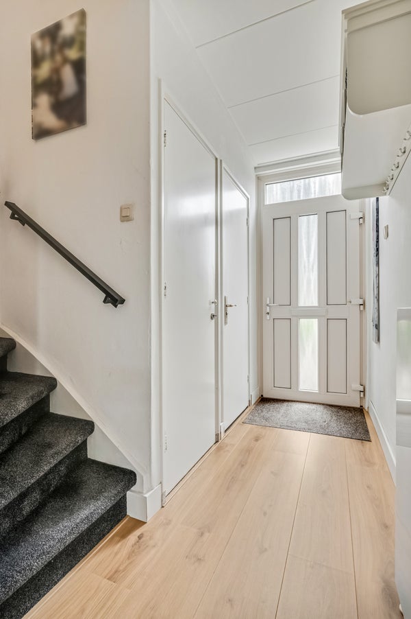 In de hal ligt, net als in de woonkamer, een mooie laminaatvloer. Het donkere tapijt op de trap en de strakke, zwarte leuningen passen goed in het geheel. Rechts in de hal zijn de fraaie toiletruimte, een bergkast en een trapkast.