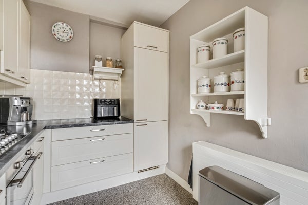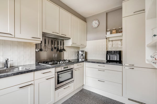 Bij het eetgedeelte is een opening naar de keuken, waar een lichte hoekopstelling met een granietlook aanrechtblad staat. De achterwand bij het kookgedeelte is uitgevoerd in rvs en verder zie je mooie, lichte tegels op de wanden. Alle benodigde apparatuur is ingebouwd: een 5-pits gaskookplaat, afzuigkap, combi-oven, vaatwasser, koelkast en een vriezer.