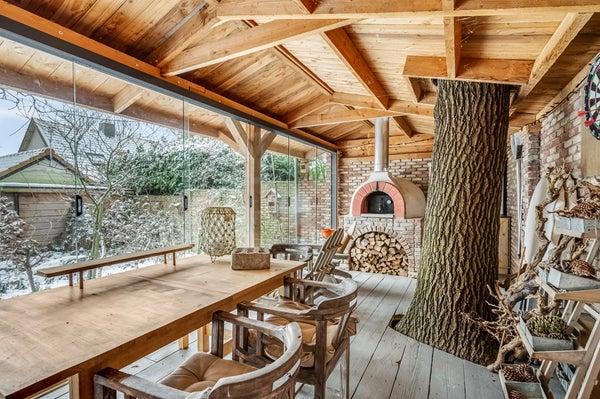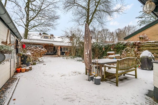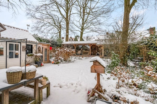 Rondom de woning ligt een prachtige groene bostuin met diverse borders, bomen, struiken en gazon. Achterin de tuin bevindt zich een zeer royale afsluitbare veranda met aangebouwd tuinhuis. De veranda is voorzien van een pizza-oven.