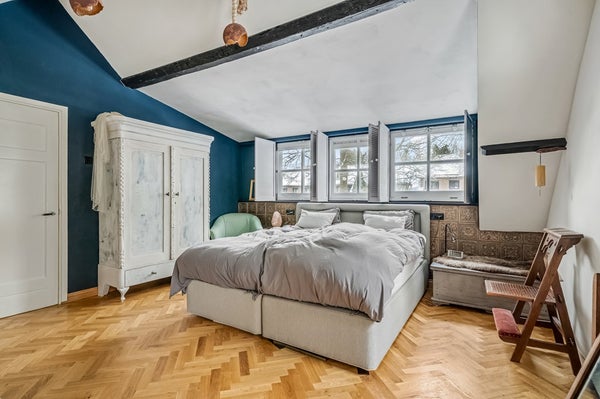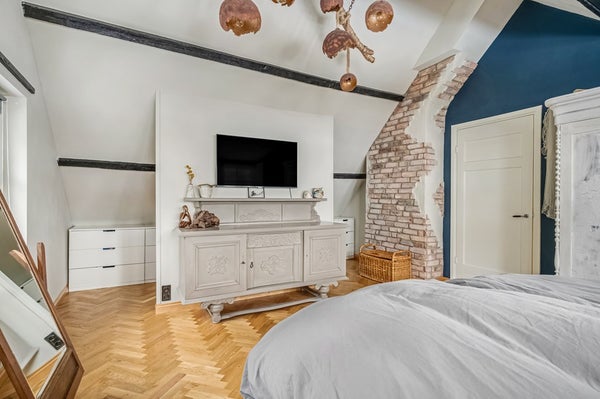 De overloop biedt toegang tot twee slaapkamers, waarvan één hele ruime kamer (die eventueel kan worden opgesplitst in 2 kamers). Deze master bedroom heeft sfeervolle roede raampjes met luiken aan de binnenzijde en een hoog balkenplafond voor een ruimtelijk effect.