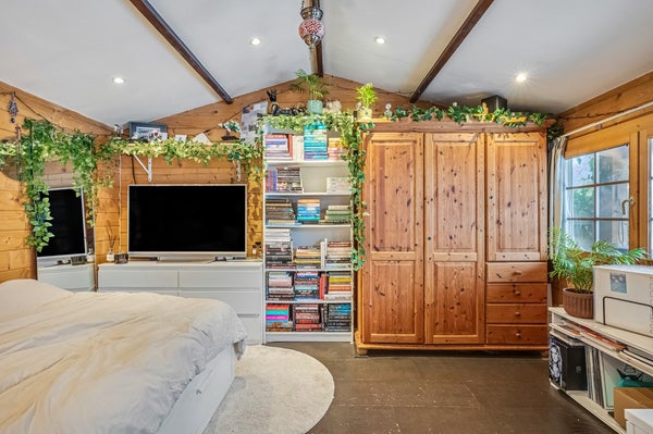 In het tuinhuis is een extra slaap/logeerkamer gerealiseerd die met een losse kachel verwarmd kan worden.