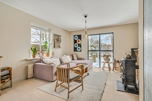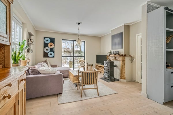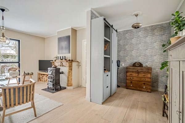 De sfeervolle woonkamer is voorzien van een mooie houten vloer en een gezellige houtkachel met daarachter een houten schouw. Door de grote raampartij tot aan de vloer aan de voorzijde is het hier heerlijk licht. De werkkamer ligt eveneens aan de voorzijde van de woning en is ook voorzien van een houten vloer.