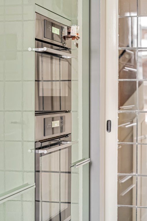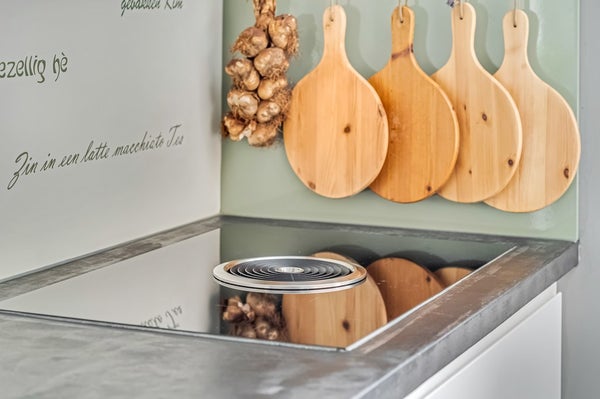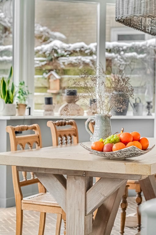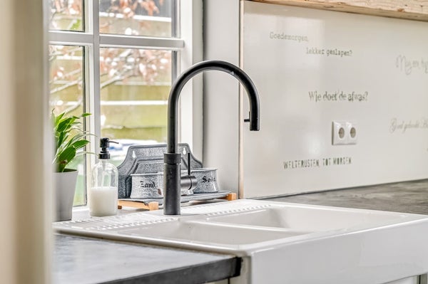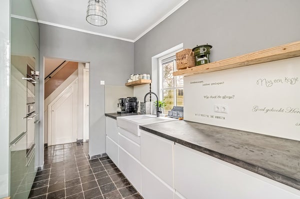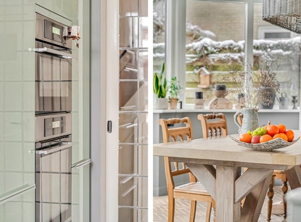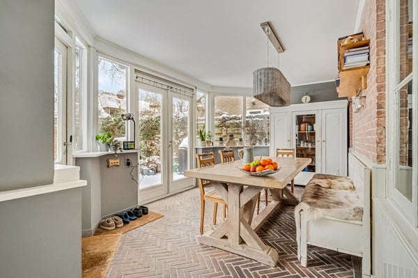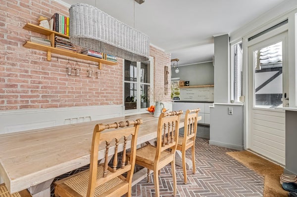 De eetkamer in de uitbouw grenst aan de keuken en is voorzien van een klinkervloer in visgraat patroon. Hier past een grote eettafel en deze ruimte grenst direct aan de achtertuin. De keuken is modern en voorzien van diverse inbouwapparatuur zoals een inductiekookplaat met afzuiging, oven (2026), magnetron, Quooker (2025), vaatwasser en koel/vriescombinatie. Deze ruimte is v.v. vloerverwarming.