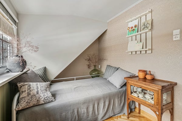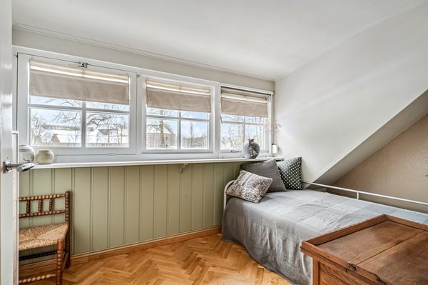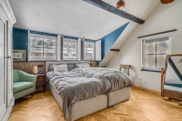 De tweede slaapkamer is voorzien van een dakkapel. Beide slaapkamers en de overloop hebben houten vloeren.