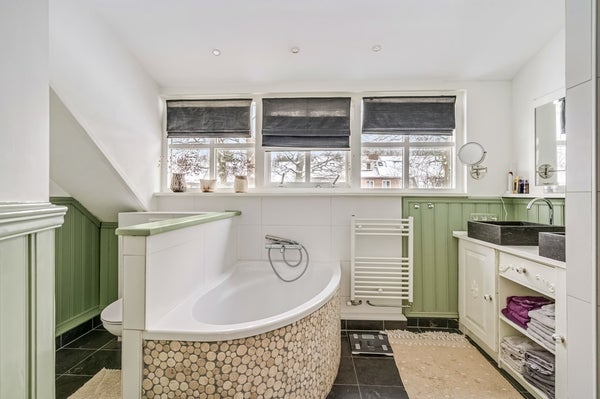 De badkamer is compleet uitgevoerd en voorzien van een dubbel wastafelmeubel, een inloopdouche, ligbad, handdoekradiator, tweede toilet en vloerverwarming.