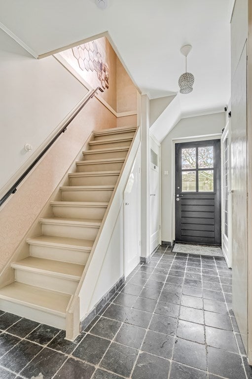 Via de middels een hek afsluitbare oprit komen we bij de voordeur. De hal met fraaie tegelvloer van Chinees hardsteen biedt toegang tot alle ruimtes en de trapopgang. Tevens bevinden zich hier de meterkast en een trapkast.