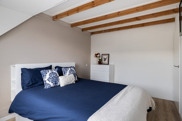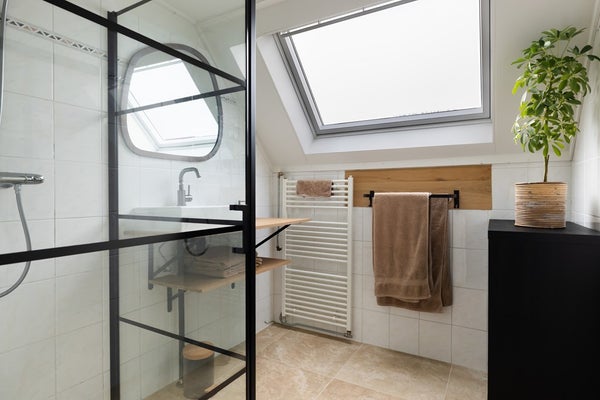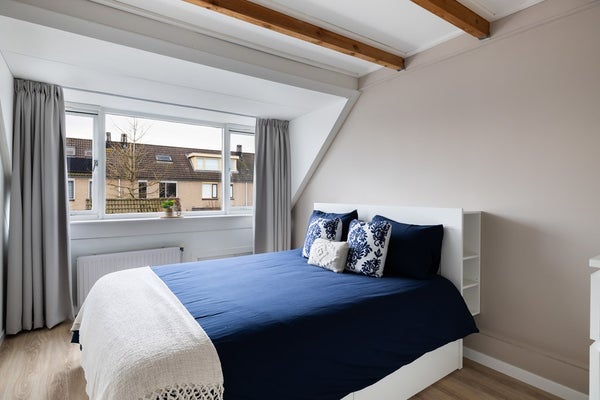 Vanaf de overloop bereik je twee ruime slaapkamers, een wasruimte en de badkamer. De badkamer aan de achterzijde is voorzien van een douchecabine, wastafelmeubel en Velux dakraam. Naast de badkamer ligt de ouderslaapkamer, terwijl aan de voorzijde de andere slaapkamer en de wasruimte zijn gesitueerd. Dankzij de dakkapellen aan zowel de voor- als achterzijde van de woning zijn deze ruimtes extra licht en ruim. Achter de knieschotten is er diverse praktische opbergruimte aanwezig. Via een luik op de overloop is de vliering met Velux dakraam en c.v.-installatie (Nefit 2023) bereikbaar.