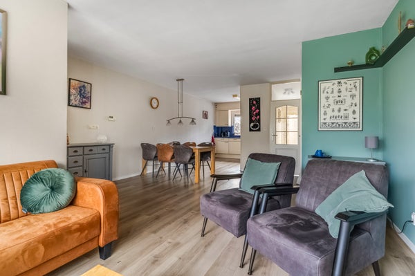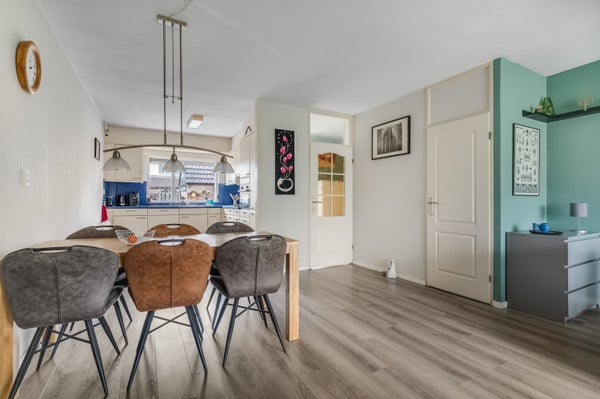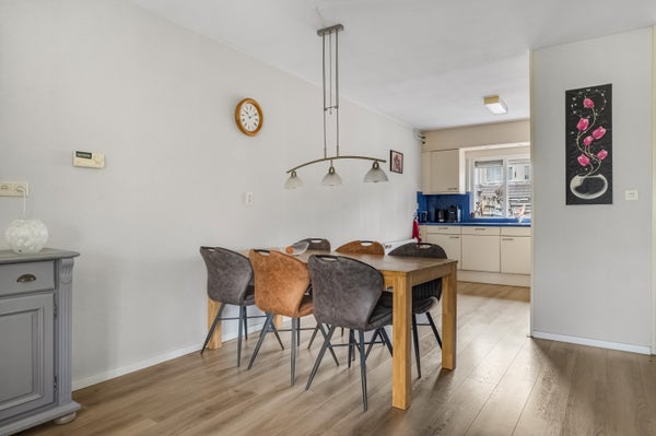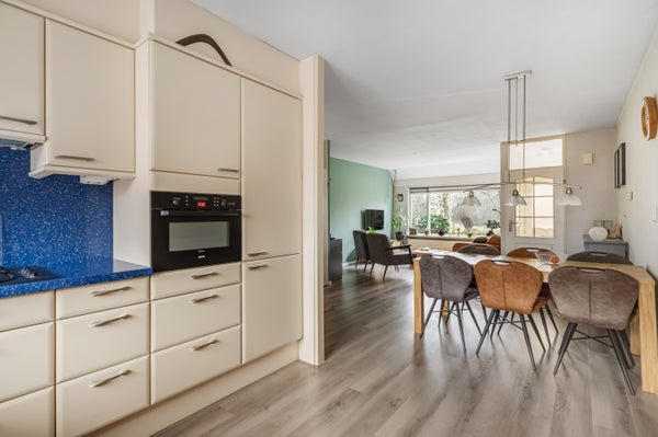 De woonkamer met open keuken heeft een maximale lengte van 10 meter, met het zitgedeelte aan de voorzijde en het eetgedeelte in het midden. Onder de trap is een handige bergkast, waardoor er geen grote kast in de woonkamer hoeft te staan.