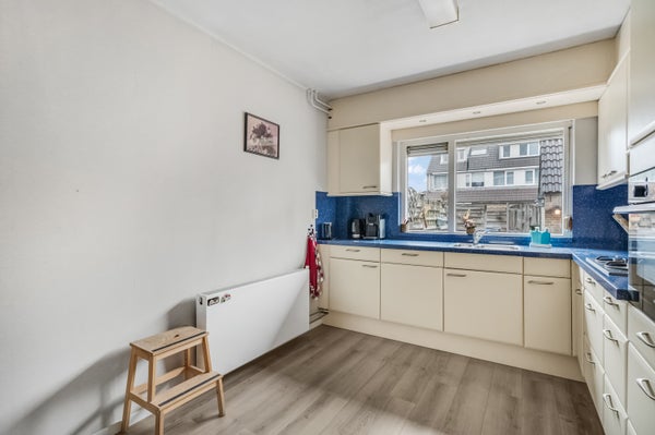 Aan de achterzijde, waar de ochtendzon naar binnen valt, is de open keuken. Hier staat een lichte hoekopstelling met een opvallend blauw aanrechtblad en achterwand, die de keuken letterlijk ‘kleur’ geven. Het spoelgedeelte is bij het raam en de gaskookplaat, afzuigkap, combi-oven, koelkast, vaatwasser en vriezer zijn ingebouwd. Naast de keuken is een tweede hal, met de trapopgang en een deur naar de achtertuin. Ook bevindt zich hier de toiletruimte, uitgevoerd met een wandcloset en een fonteintje.