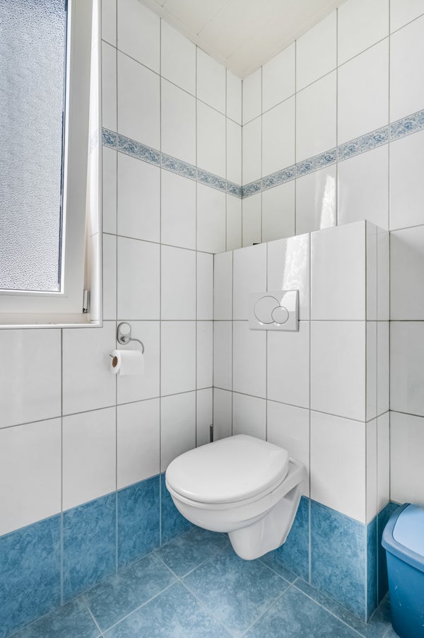 De badkamer is uitgevoerd in dezelfde stijl als de toiletruimte beneden. Het draai-/kiepraam met ventilatierooster zorgt voor lichtinval en de ruimte is ingedeeld met een douche, toilet, handdoekenradiator en een badmeubel met wastafel.