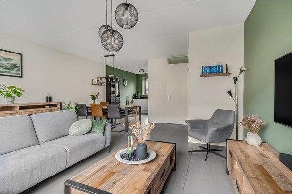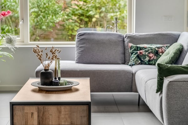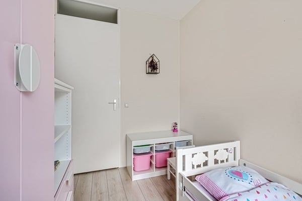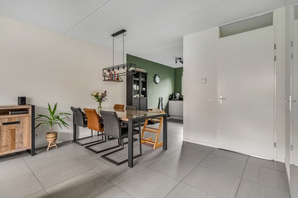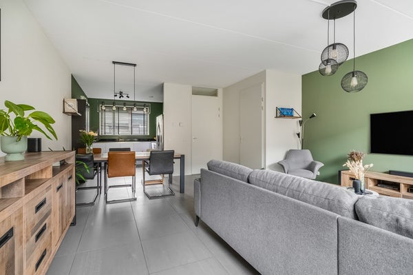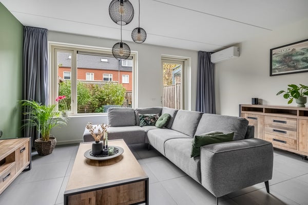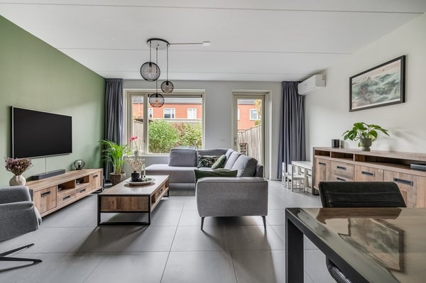 De tuingerichte woonkamer is heerlijk licht, beschikt over een deur naar de achtertuin en een praktische trapkast. De strakke afwerking maakt dat verhuizen hier direct mogelijk is. Door de recent geïnstalleerde airconditioning blijft het hier ook in de zomer heerlijk koel.