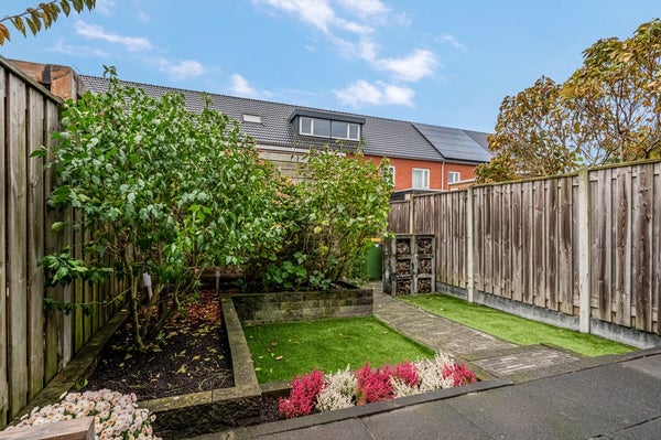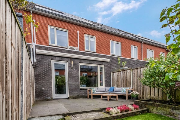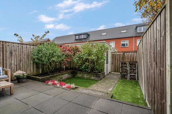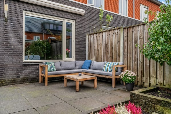 De zonnige achtertuin ligt op het zuidwesten, waardoor je al vroeg in het voorjaar van de zon kunt genieten. De tuin is verzorgd aangelegd met een ruim terras, verhoogde borders, twee grasgedeelten en een houten berging. Aan de achtergevel hangt een breed, elektrisch bedienbaar zonnescherm. Via de poort bereik je de gezamenlijke achterom.