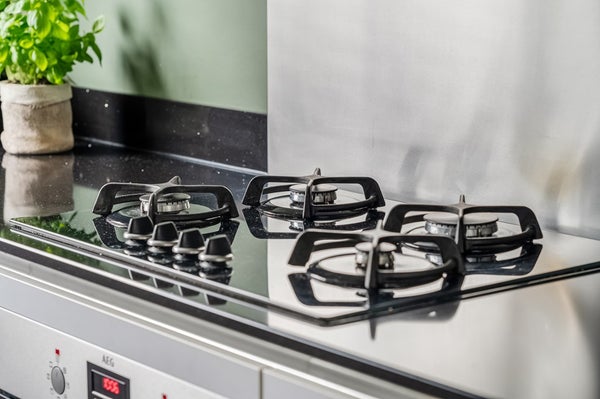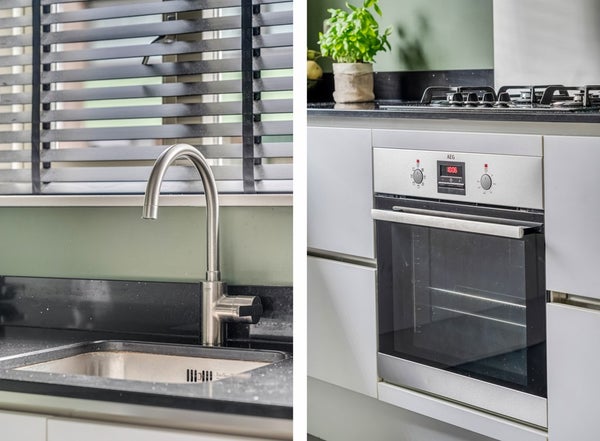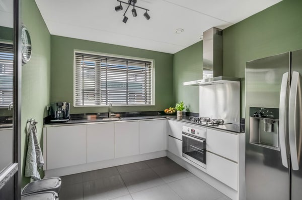 Aan de voorzijde bevindt zich de open keuken met moderne hoekopstelling en alle gewenste inbouwapparatuur, waaronder een gaskookplaat met afzuigkap, oven (2025), vaatwasser (2025) en een Amerikaanse koel-vriescombinatie (ter overname). Vanuit de keuken kijk je vrij uit over de rustige straat en het groen voor de woning.