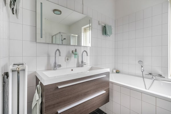 Vanaf de overloop zijn drie slaapkamers en de ruime badkamer bereikbaar. De gehele verdieping is voorzien van een nette laminaatvloer. De badkamer is licht betegeld en ingericht met een ruim ligbad, aparte douche, tweede toilet en een wastafelmeubel. Dankzij het raam is er prettig daglicht en natuurlijke ventilatie.