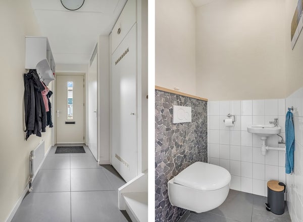De woning is van hal tot zolder keurig afgewerkt. In de hal bevinden zich de vernieuwde toiletruimte (2022), de meterkast en de trapopgang. De stijlvolle grijze tegelvloer met comfortabele vloerverwarming loopt door over de gehele begane grond en zorgt voor een luxe uitstraling.