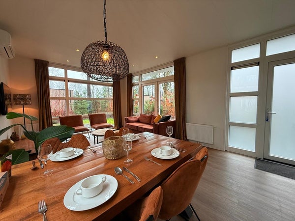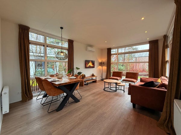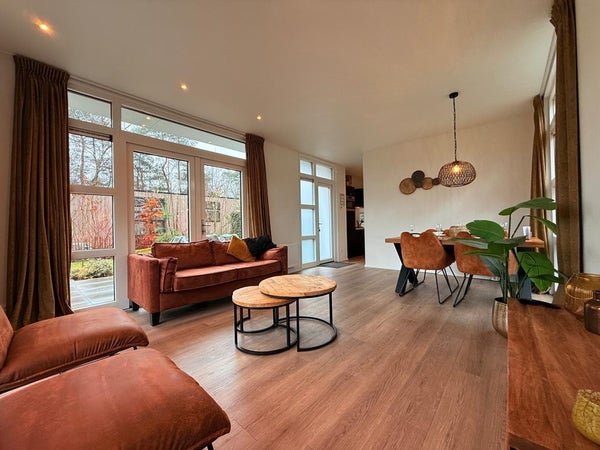 De woonkamer voelt direct ruim en uitnodigend aan, met een prettige lichtinval en een open indeling die zorgt voor een fijne, ontspannen sfeer. Hier komt u samen na een dag buiten, geniet u van een goed gesprek of zakt u simpelweg onderuit met een boek terwijl het daglicht zacht naar binnen valt. De ruimte is modern afgewerkt en straalt rust en comfort uit.