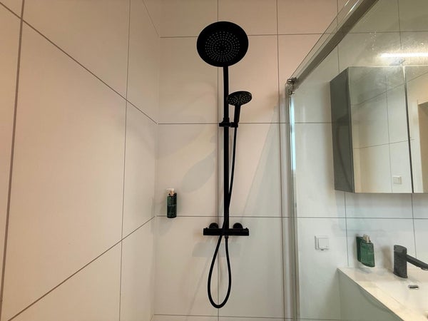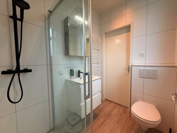 De badkamer is fris en netjes uitgevoerd en vormt een prettige ruimte om de dag te beginnen of juist ontspannen af te sluiten. Alles is verzorgd en overzichtelijk, waardoor u hier geniet van comfort en gemak in een moderne setting.