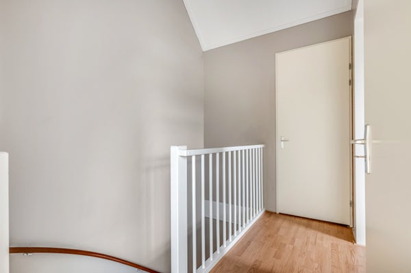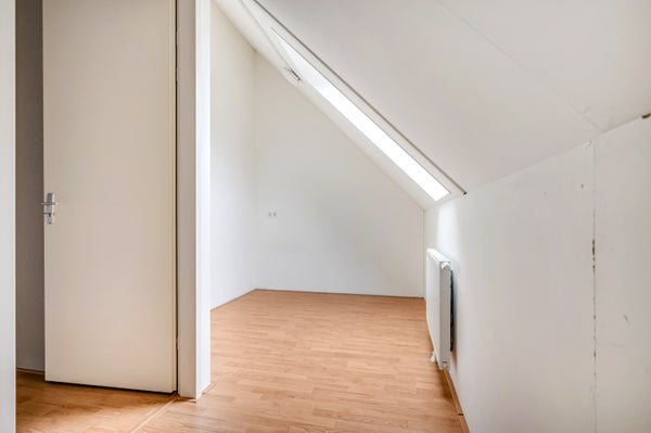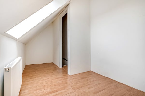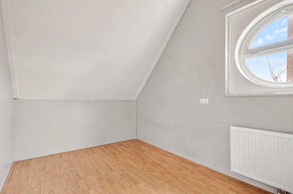Oorspronkelijk was er een grote, open ruimte op deze verdieping. En nu? Twee slaapkamers, een overloop én een wasruimte. Er ligt, net als op de eerste verdieping, laminaat op de vloer en het ronde raam in de zijgevel is een echte blikvanger.