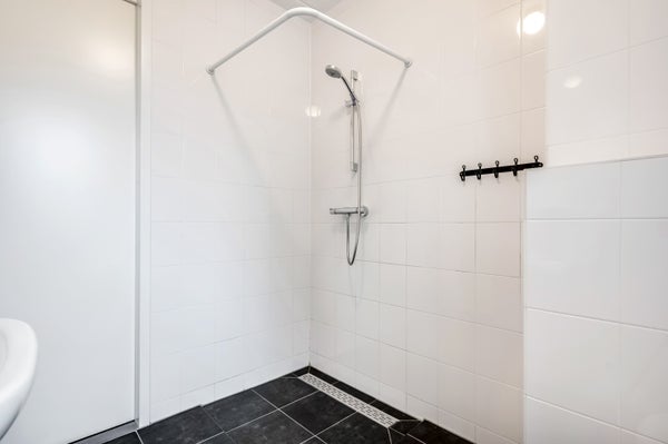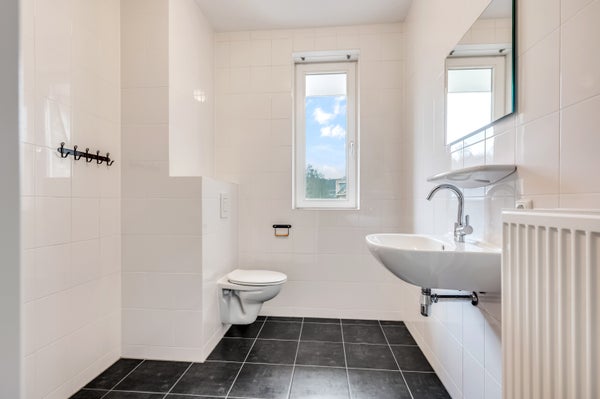 Aan de voorzijde is de badkamer, met veel lichtinval via het hoge raam. De muren en de vloer zijn geheel betegeld en de ruimte is ingedeeld met een douche, wandcloset en een wastafel. Ook hier zie je geheel betegelde wanden in een lichte kleur, en donkere tegels op de vloer.