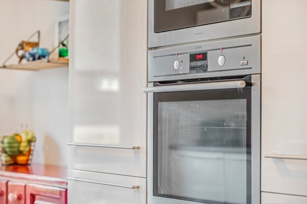 Wat opvalt in de keuken is de grootte, ingedeeld met een lange wandopstelling en een hoge kastenwand. Het donkere aanrechtblad past goed in het geheel en alle benodigde apparatuur is ingebouwd: een inductie kookplaat, afzuigkap, vaatwasser, close-in boiler, oven met onder andere een pyrolyse functie, magnetron, koelkast en een kokend waterkraan.