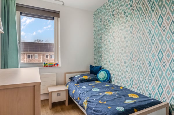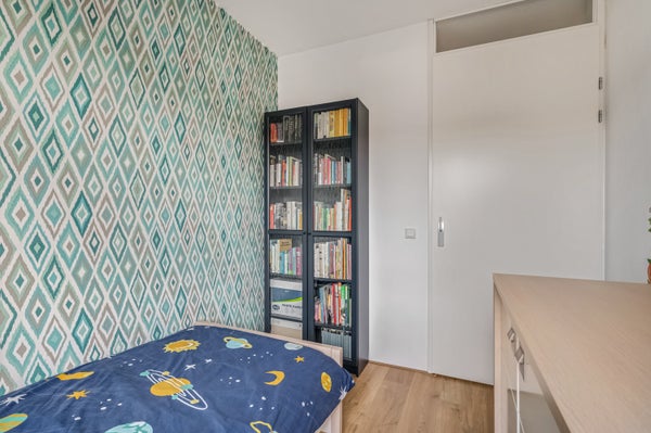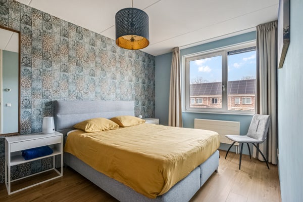 Vanaf de overloop is er toegang tot drie ruime slaapkamers, waarvan twee groot genoeg zijn om te gebruiken als master bedroom. Ga je aan de voorzijde slapen, met de ochtendzon, of aan de achterzijde? In alle slaapkamers ligt laminaat op de vloer en in alle slaapkamers zie je patroonbehang op een van de wanden. Dat zorgt voor kamers met sfeer, klaar voor een nieuwe invulling.