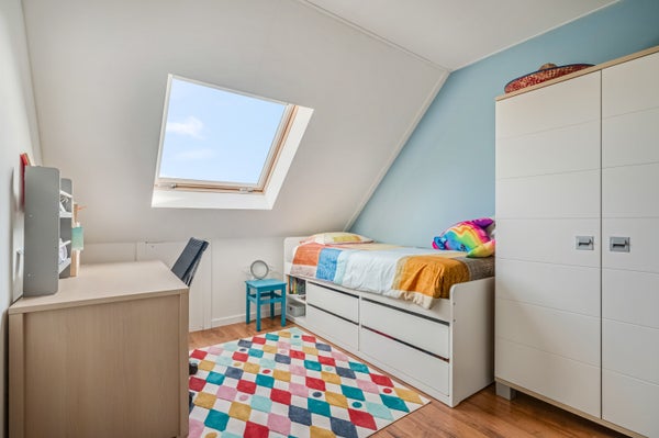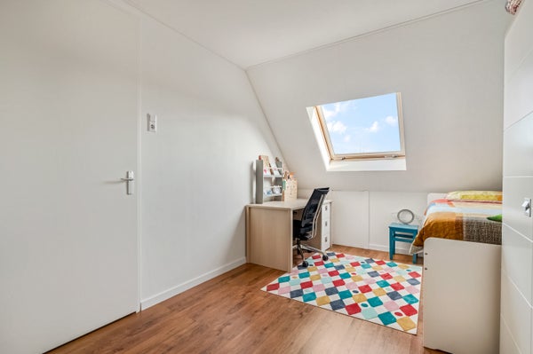 Op deze verdieping is de vierde ruime slaapkamer, met een dakraam en bergruimte in de schuinte van het dak. Boven het plafond is een berging, te bereiken vanaf de overloop.