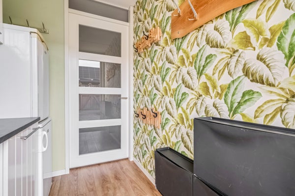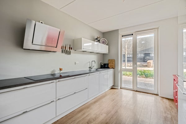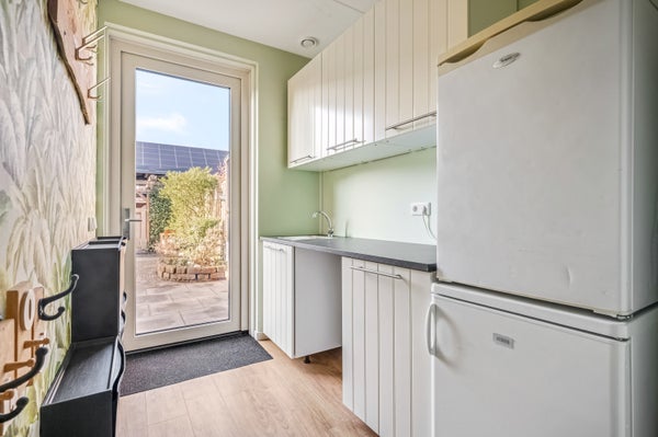 Een groot pluspunt is de bijkeuken, bij de aanbouw aan de achterzijde. Deze ruimte, met een spoelbak en vaste kasten, fungeert tevens als tweede entree. Dat is handig als je met de auto of fiets thuis komt!