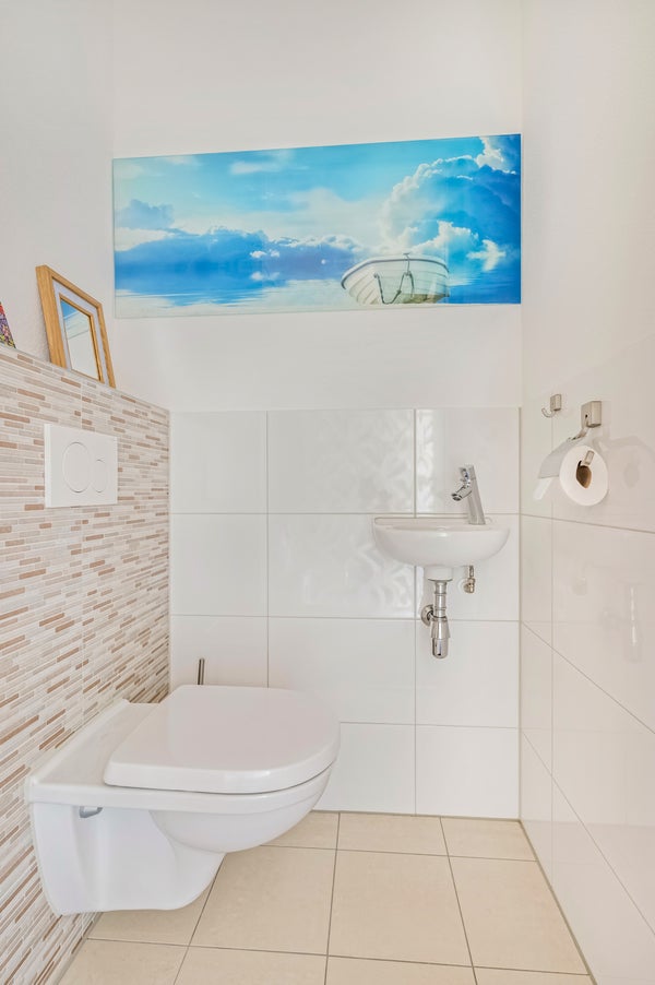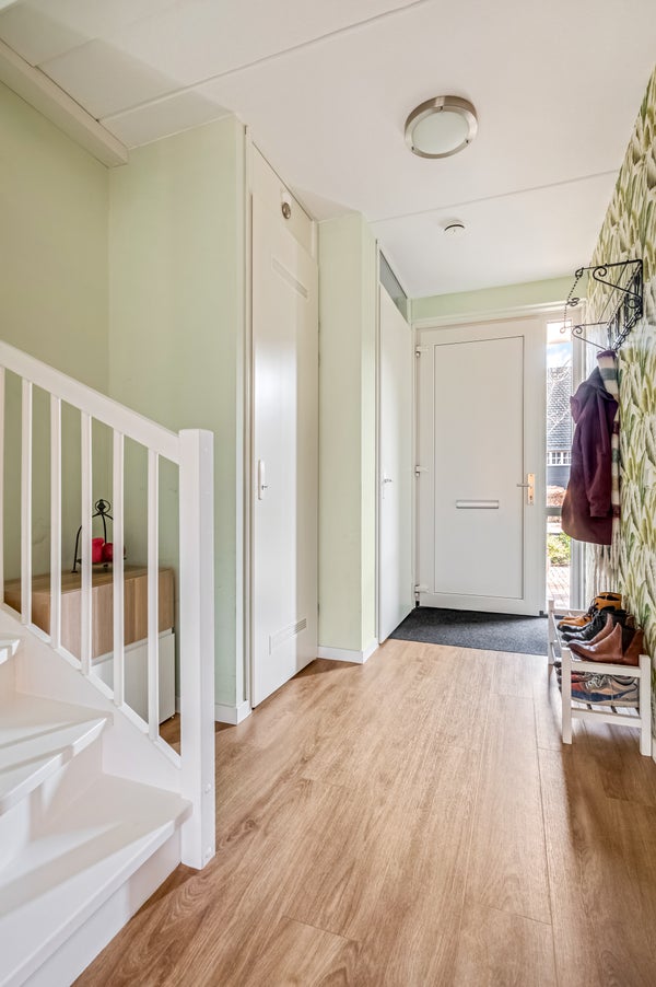 Licht, kleur en sfeer zijn in balans in de hal. De pvc vloer ligt op bijna de hele begane grond en aan de rechterzijde zijn de toiletruimte, meterkast en de trap naar de eerste verdieping. Ook is de begane verdieping voorzien van vloerverwarming en -koeling. Door de ramen naast de voordeur valt de heerlijke ochtendzon naar binnen.