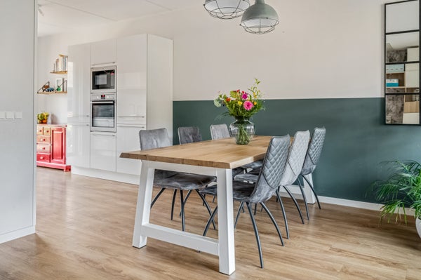 Met een lengte van meer dan 10.50 meter biedt de woonkamer met halfopen keuken een leefruimte van goed formaat. En dat is meer dan standaard, want de woonkamer is aan de achterzijde uitgebouwd. Het zitgedeelte is aan de achterzijde, bij de openslaande tuindeuren, en het eetgedeelte grenst aan de keuken.