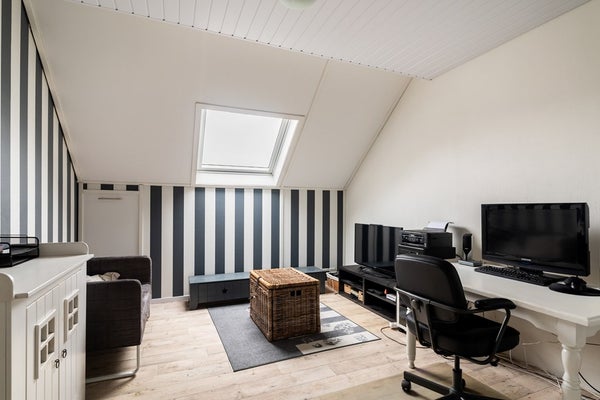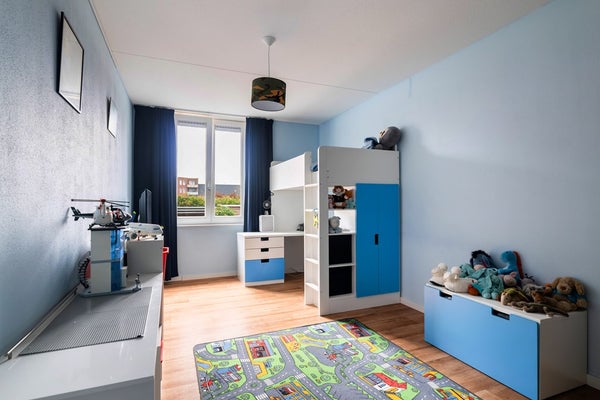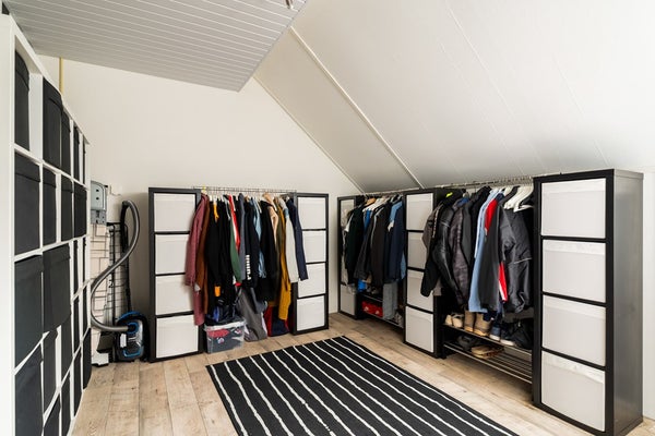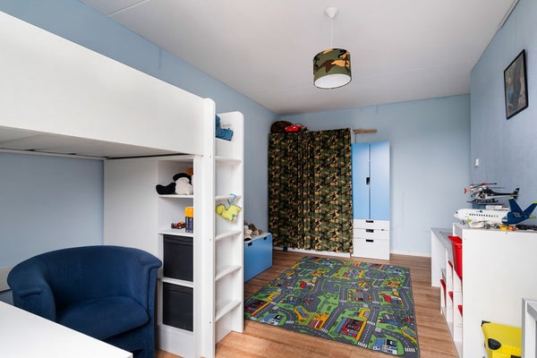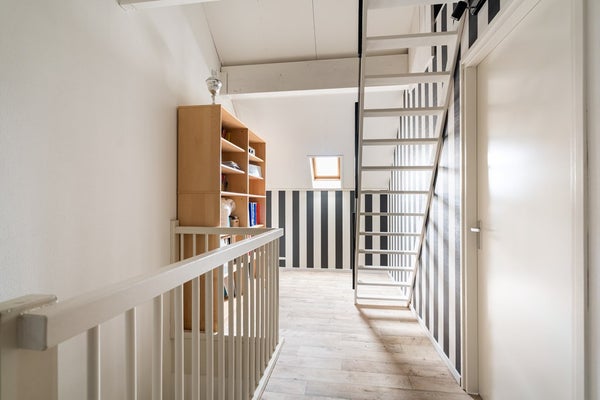 Via een vaste trap bereik je de ruime overloop van de tweede verdieping, die toegang geeft tot twee royale slaapkamers en daarnaast — eveneens via een vaste trap — tot de praktische bergzolder. De slaapkamer aan de voorzijde is voorzien van aansluitingen voor wasmachine en droger, de mv-box en de omvormer van de 14 zonnepanelen, waardoor deze ruimte ook ideaal te gebruiken is als comfortabele wasruimte. Beide slaapkamers beschikken over knieschotten, wat zorgt voor verrassend veel bergruimte. Voor een prettige lichtinval zijn zowel de overloop als beide slaapkamers voorzien van een Velux-dakraam. Ook op deze verdieping ligt een onderhoudsvriendelijke vinylvloer in combinatie met vloerverwarming.
