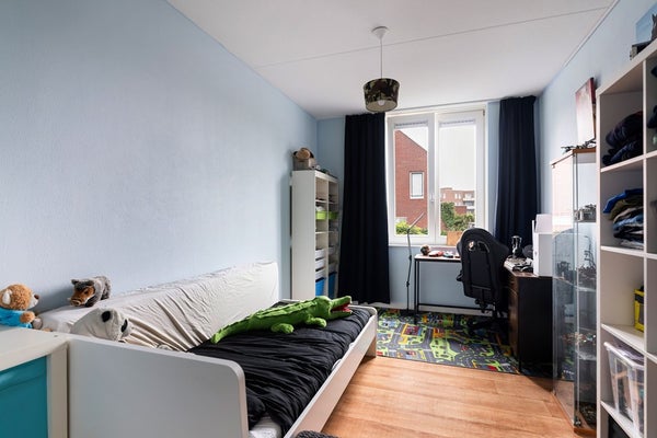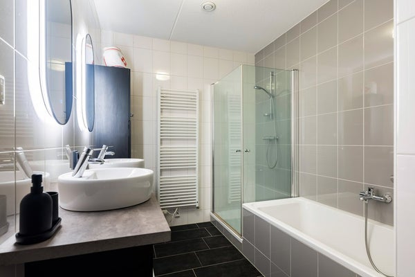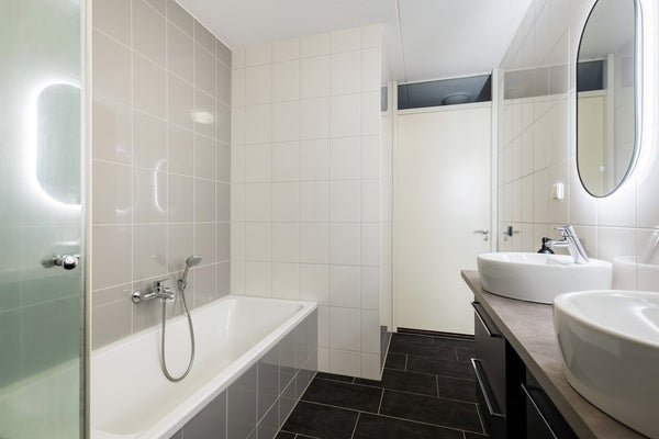 De overloop op de eerste verdieping vormt de verbinding naar drie royale slaapkamers, de separate toiletruimte en de badkamer. De moderne badkamer, uitgevoerd in een rustige, neutrale kleurstelling, is volledig betegeld en uitgerust met een dubbel wastafelmeubel met dubbele waskommen en verlichte spiegels, een designradiator, een comfortabel ligbad en een separate douche. De toiletruimte is eveneens volledig betegeld en voorzien van een strak wandcloset met fontein. Alle drie de slaapkamers zijn ruim en licht van opzet; de kamers aan de achterzijde beschikken over praktische draai-kiepramen. De ouderslaapkamer, gesitueerd aan de voorzijde en over de volledige breedte van de woning, vormt een echte eyecatcher en biedt via openslaande deuren directe toegang tot het balkon aan de voorzijde — een heerlijke plek om de dag te beginnen of juist rustig af te sluiten. Tot slot is de gehele verdieping voorzien van een vinyl vloer en vloerverwarming.
