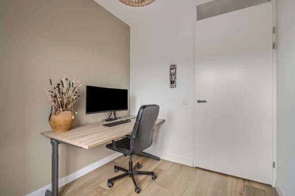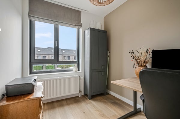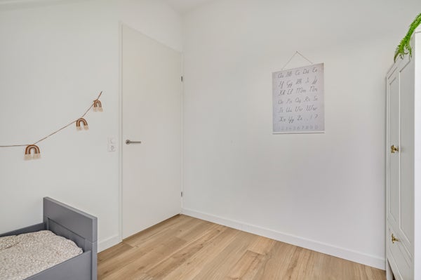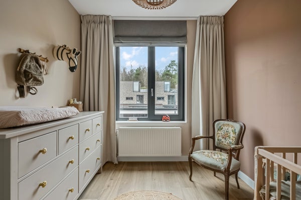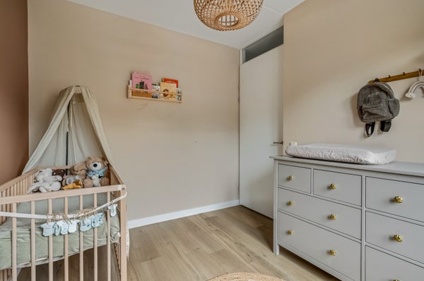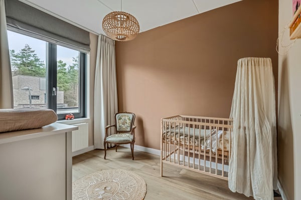 Op de eerste verdieping zijn drie slaapkamers, waarvan twee aan de achterzijde. Deze kamers zijn nu in gebruik als werkkamer en als sfeervolle master bedroom, waar warme kleuren de sfeer bepalen. Aan de voorzijde is de derde slaapkamer, ingericht als babykamer. Vanuit hier kijk je richting het bos, over en naast de woningen aan de overzijde van de straat.