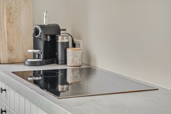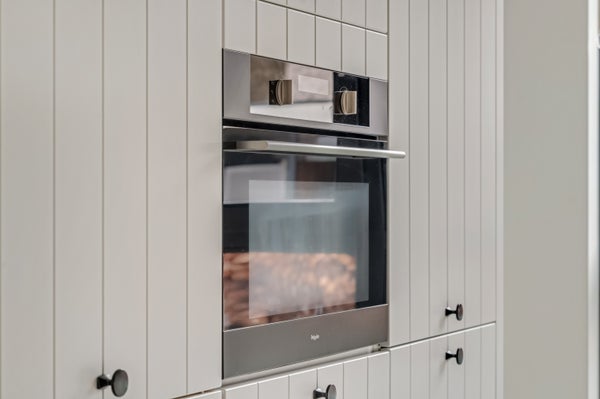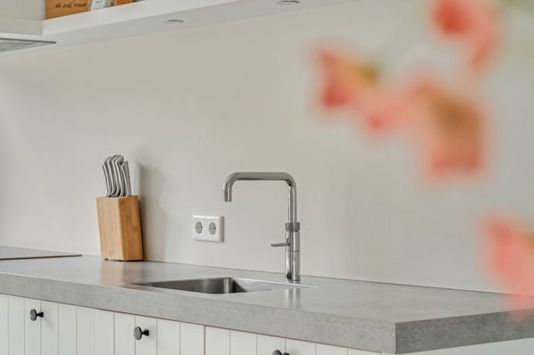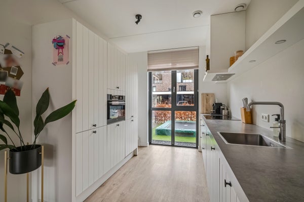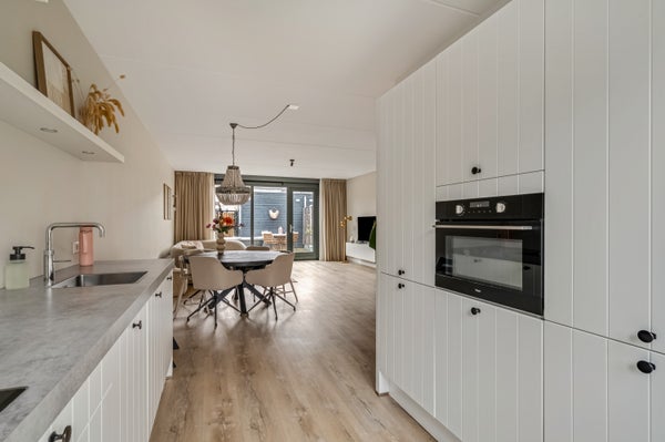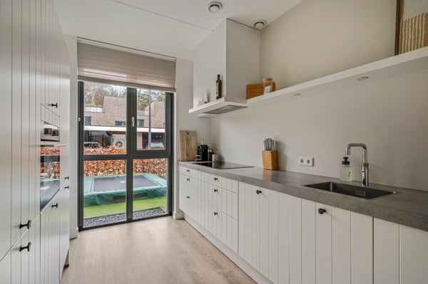 Niet alleen in de woonkamer, maar ook in de keuken zie je ramen tot vloerhoogte. Zo is er een optimale verbinding met de tuin en de rustige straat. De keuken is ingedeeld met een grote kastenwand en een lange wandopstelling, uitgevoerd met een betonlook aanrechtblad. Alle benodigde apparatuur is ingebouwd: een inductie kookplaat, afzuigkap, vaatwasser, Quooker, combi-oven, koelkast en een vriezer.