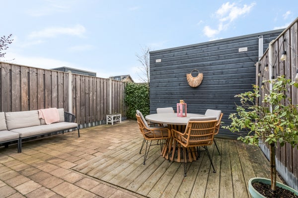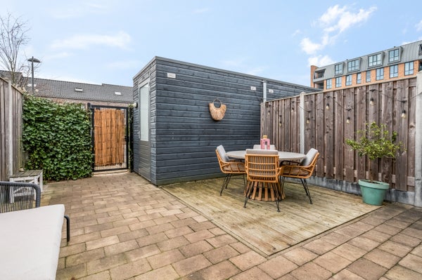 De voortuin, op het noorden, wordt nu als speelplek van de kinderen gebruikt. Zo kan de ruimte in de achtertuin worden gebruikt om in de zon te zitten, wat met een ligging op het zuiden geen probleem is. In de berging kunnen de (kinder)fietsen staan en er is een poort naar de Piet Smithof, een rustige straat met parkeergelegenheid.