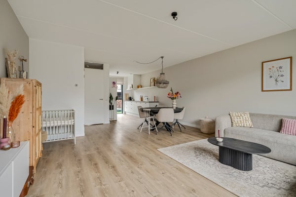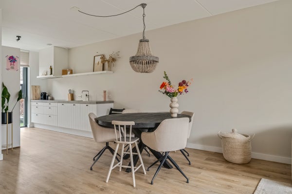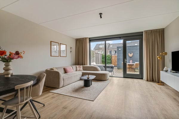 Grote ramen aan de zuidkant zorgen voor veel licht in de woonkamer, die groot genoeg is om een grote zithoek en een eettafel neer te zetten. Ook hier wordt de sfeer bepaald door lichte, neutrale kleuren wat het gevoel van ruimte vergroot. Erg handig; onder de trap is een kast waar je veel spullen kunt opbergen.