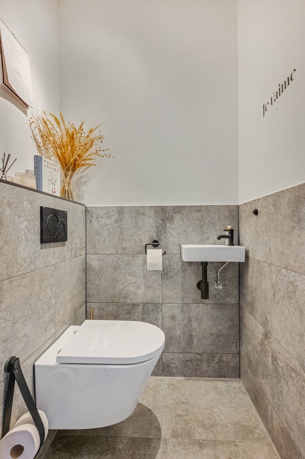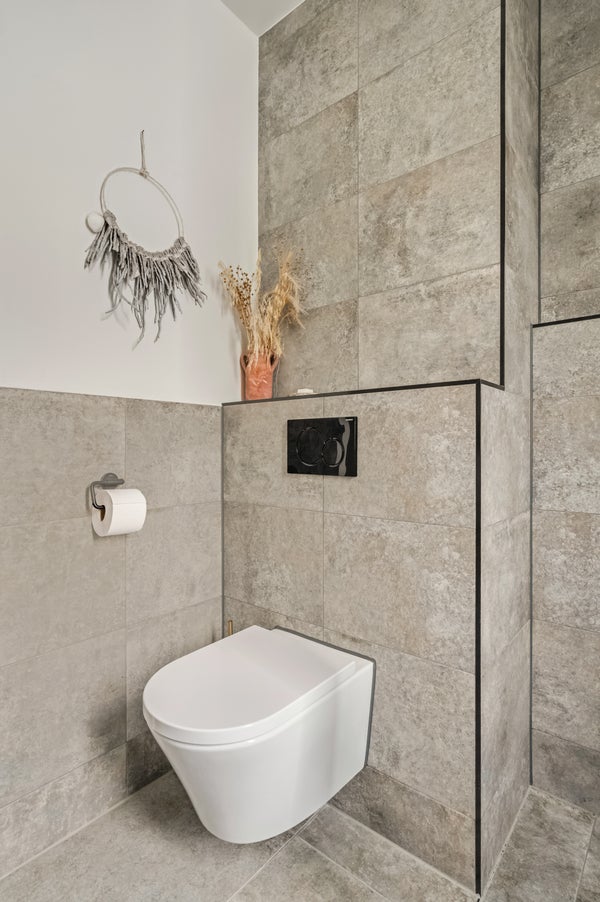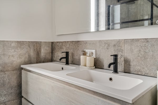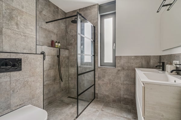 De moderne badkamer is uitgevoerd in dezelfde stijl als de toiletruimte op de begane grond. Grote, grijze tegels zijn gecombineerd met zwarte kranen en via het raam valt het daglicht naar binnen. Je hebt de beschikking over een inloopdouche, een wandcloset en een badmeubel voorzien van twee wastafels.