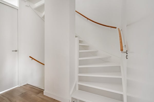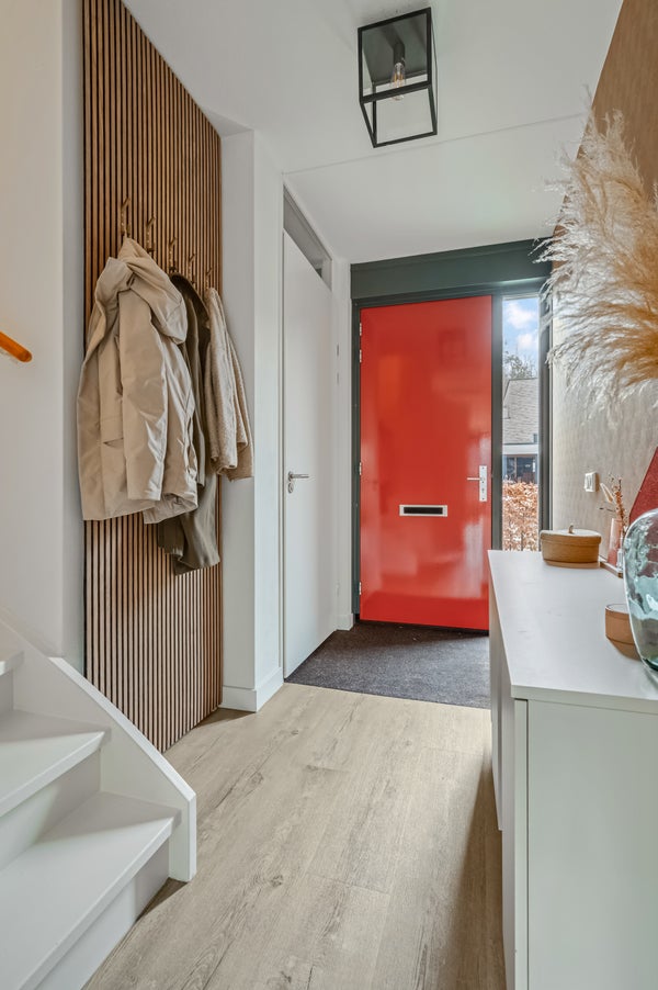 Achter de rode voordeur gaat een supergaaf huis verscholen! In de hal, naast de garderobe, is de fraaie toiletruimte en de trap naar de eerste verdieping is in een lichte kleur geschilderd. De houtlook pvc-vloer met vloerverwarming is uitgevoerd in een lichte, warme kleur. Je vindt deze vloer niet alleen in de hal, maar ook in de woonkamer en keuken.
