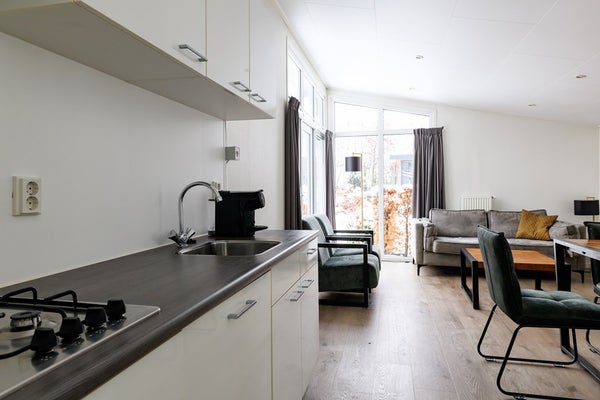 U komt binnen in een gezellige, lichte woonkamer waar u zich direct thuis voelt. De open keuken sluit hier mooi op aan en is compleet uitgerust dus perfect om samen te koken of te geniet...