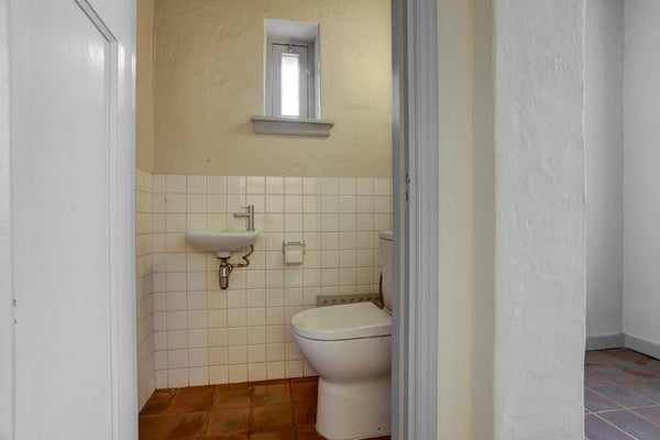 De badkamer is royaal van formaat en voorzien van een ligbad, douche, closet en dubbele wastafel. De ruimte is volledig betegeld en heeft een houten plafond. Een ingebouwde kast biedt handige opbergruimte voor handdoeken en verzorgingsproducten. Hoewel de badkamer functioneel is, verdient deze een eigentijdse update. Een uitgelezen kans om hier jouw eigen droombadkamer te creëren.