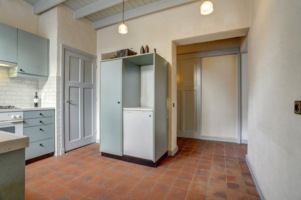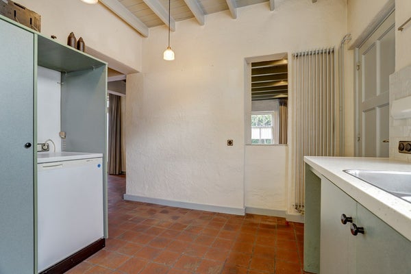 Vanuit de imposante entree loop je door naar de sfeervolle living, waar je aan de rechterzijde direct contact hebt met de speels ingedeelde keuken. Deze charmante ruimte is subtiel afgescheiden van het leefgedeelte, waardoor je geniet van zowel openheid als rust. De authentieke sfeer van het huis zet zich hier moeiteloos voort: een plavuizenvloer en een houten plafond zorgen voor een warme, huiselijke uitstraling.