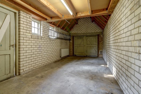 Aan de linkerzijde van de woning bevindt zich een karaktervolle garage, volledig in stijl met het huis. Voorzien van dubbele openslaande deuren naar de oprit, een praktische loopdeur en ramen met roedeverdeling, ademt deze garage dezelfde charme als de woning zelf. Het sierlijke puntdak met vlizozolder maakt het plaatje compleet. Een ideale ruimte voor de hobbyist, klusser, of simpelweg om de auto droog en veilig te stallen.