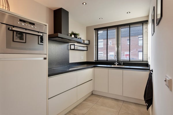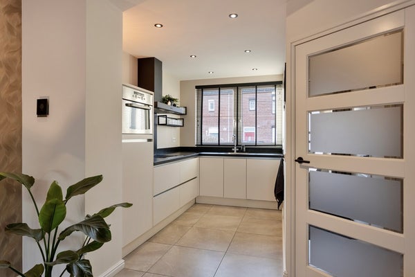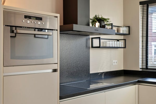 De keuken is aan de voorzijde van de woning gesitueerd en uitgevoerd in een moderne L-opstelling met witte, greeploze fronten. De keuken is voorzien van diverse inbouwapparatuur, waaronder een elektrische kookplaat, afzuigkap, combi-oven, vaatwasser en koelkast. Een fijne en praktische plek om uitgebreid te koken en te genieten van het dagelijks leven.