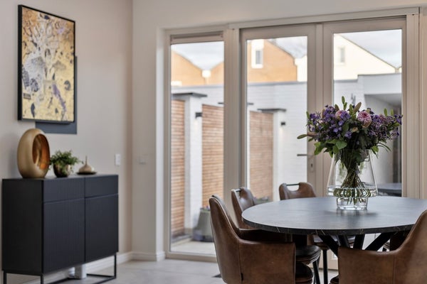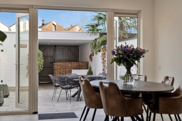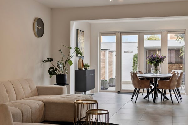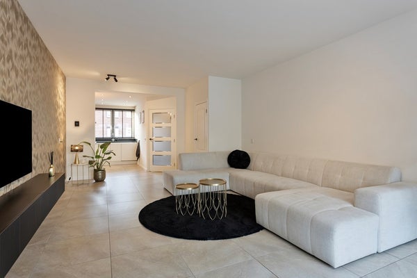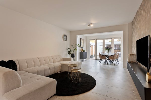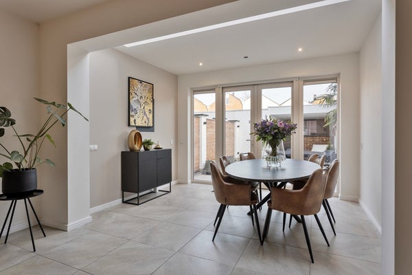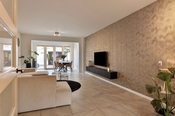 De royale en sfeervolle woonkamer met open keuken heeft een totale oppervlakte van circa 46 m² en is afgewerkt met dezelfde fraaie tegelvloer als in de entree, wat zorgt voor een rustige en uniforme uitstraling. Dankzij de grote raampartijen aan de voorzijde en de openslaande deuren met lichtstraat aan de achterzijde geniet deze leefruimte van een prettige, natuurlijke lichtinval gedurende de hele dag. De deuren aan de achterzijde bieden direct toegang tot de tuin en creëren een mooie verbinding tussen binnen en buiten.