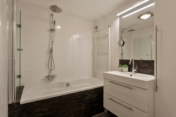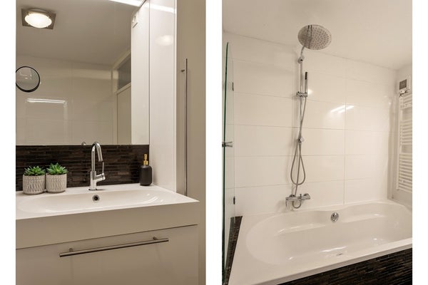 • Badkamer: De betegelde badkamer (ca. 4 m² groot) is modern afgewerkt en voorzien van een ligbad met douche, een wastafelmeubel en een handdoekradiator.