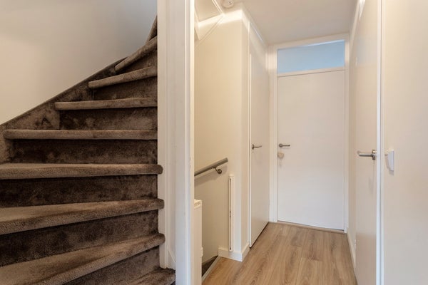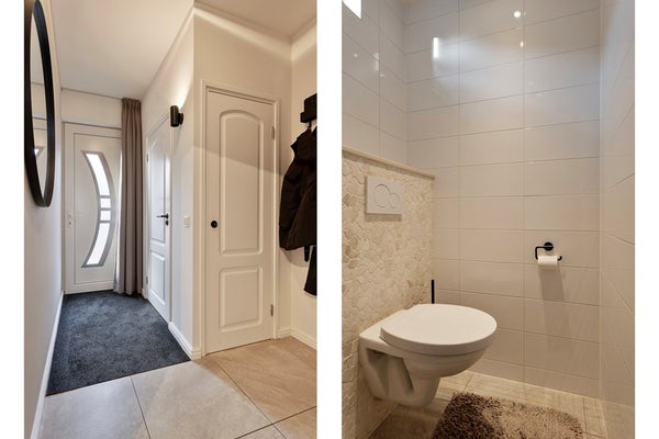 Via de entree (ca. 6 m²), afgewerkt met een lichtkleurige tegelvloer, betreedt u de woning. In de entree bevinden zich de meterkast, de moderne toiletruimte, de trapopgang naar de eerste verdieping en de toegang tot de woonkamer met open keuken. De toiletruimte is geheel betegeld en voorzien van een hangcloset. De gehele begane grond is uitgerust met comfortabele vloerverwarming, wat bijdraagt aan een aangenaam wooncomfort.