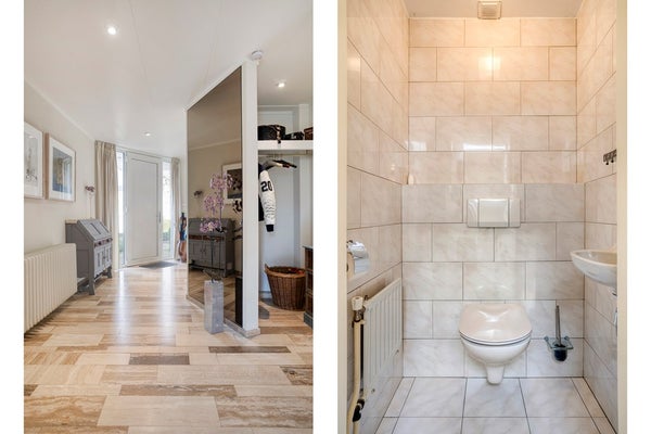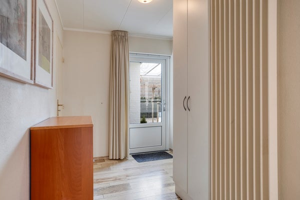 U betreedt de woning via de royale en lichte entree van circa 19 m², voorzien van een stijlvolle tegelvloer die doorloopt in de rest van de woning en zorgt voor een rustige, samenhangende uitstraling. Vanuit de entree heeft u toegang tot de meterkast, de woon- en eetkamer, de keuken, de serre, de eerste slaapkamer, een tussenhal en een kleinere gang met trap naar het souterrain. Daarnaast beschikt de entree over een garderobe en praktische kastruimte.